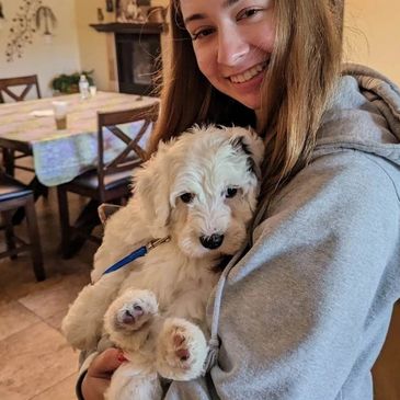 Our family is so happy with our sweet pup! She is a toy Aussie Mountain Doodle. Beautiful coat, gorgeous blue eyes and such a love. She's great with our children and others. She is healthy, energetic and loves to cuddle. Sunny Ridge Doodles was great to work with. Professional, helpful and they truly care for these pups. Kelly continu