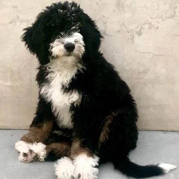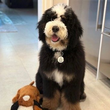 Now that we have all survived the first 6 months of puppyhood, I can honestly say we are absolutely in LOVE with our SUNNYRIDGE doodle ENZO (formerly "Gomez" of the Adams Family littler). Enzo has won his way into everyone's hearts and is the sweetest, smartest, and silliest puppy ! He has a BIG personality! We live in a very dog friendly neighborhood, and let's just say half the neighborhood already knows ENZO by name! He literally stops traffic b/c people are amazed by his Bernedoodle good looks and those "socks"! Kelly has been fantastic since Day 1 and through the entire process and is always available to answer any questions we may have. Thank you Kelly and family! If Enzo ever needs a playmate someday, we would definitely adopt a Sunnyridge doodle!